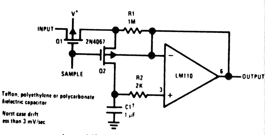 Este es otro circuito de muestreo y retención encontrado en un manual de fábrica de los años 80. El circuito se puede implementar con componentes más modernos. El FET utilizado no es un componente común actualmente.