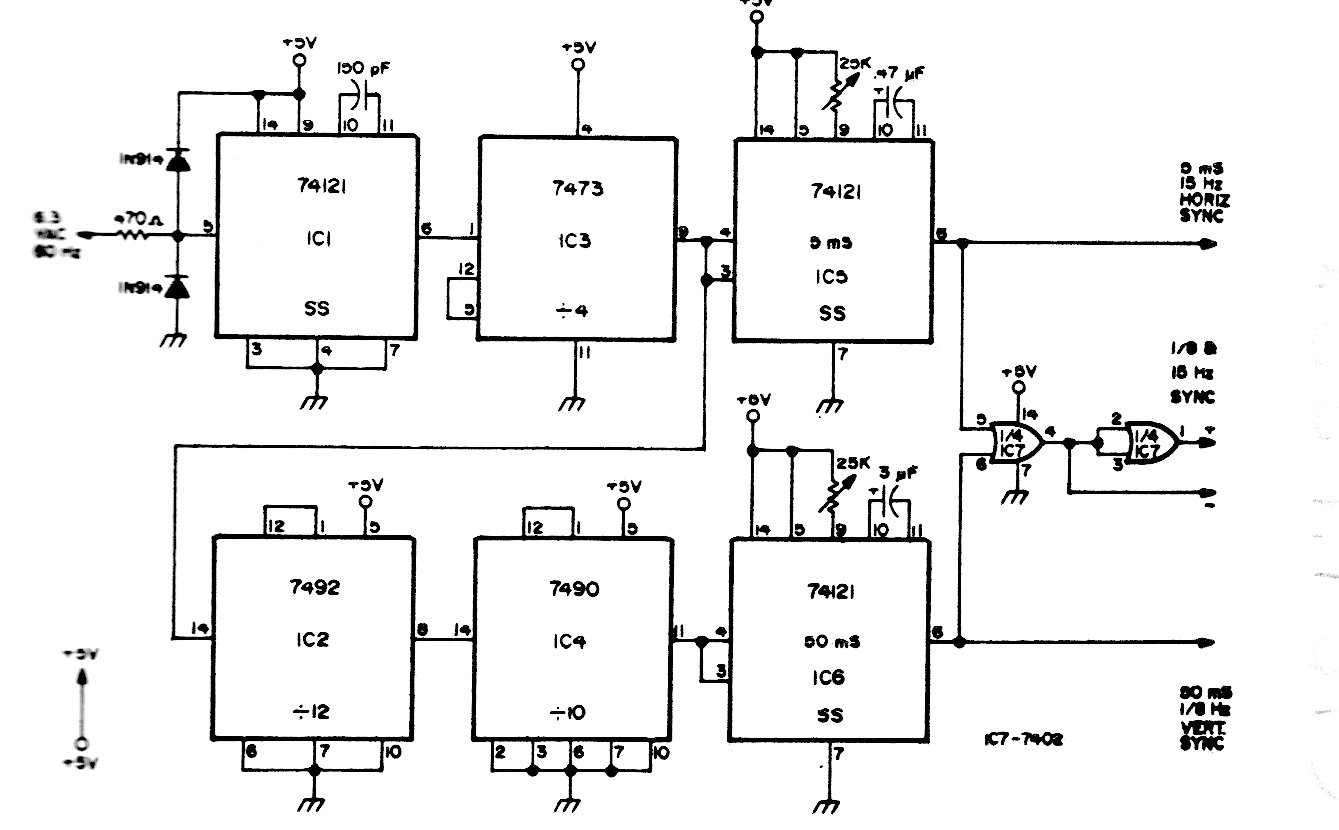 Originalmente este circuito fue creado para producir pulsos de sincronismo en cámaras de TV SSTV (baja frecuencia de exploración), sin embargo puede adaptarse a otros propósitos. Los circuitos integrados usados son TTL comunes.