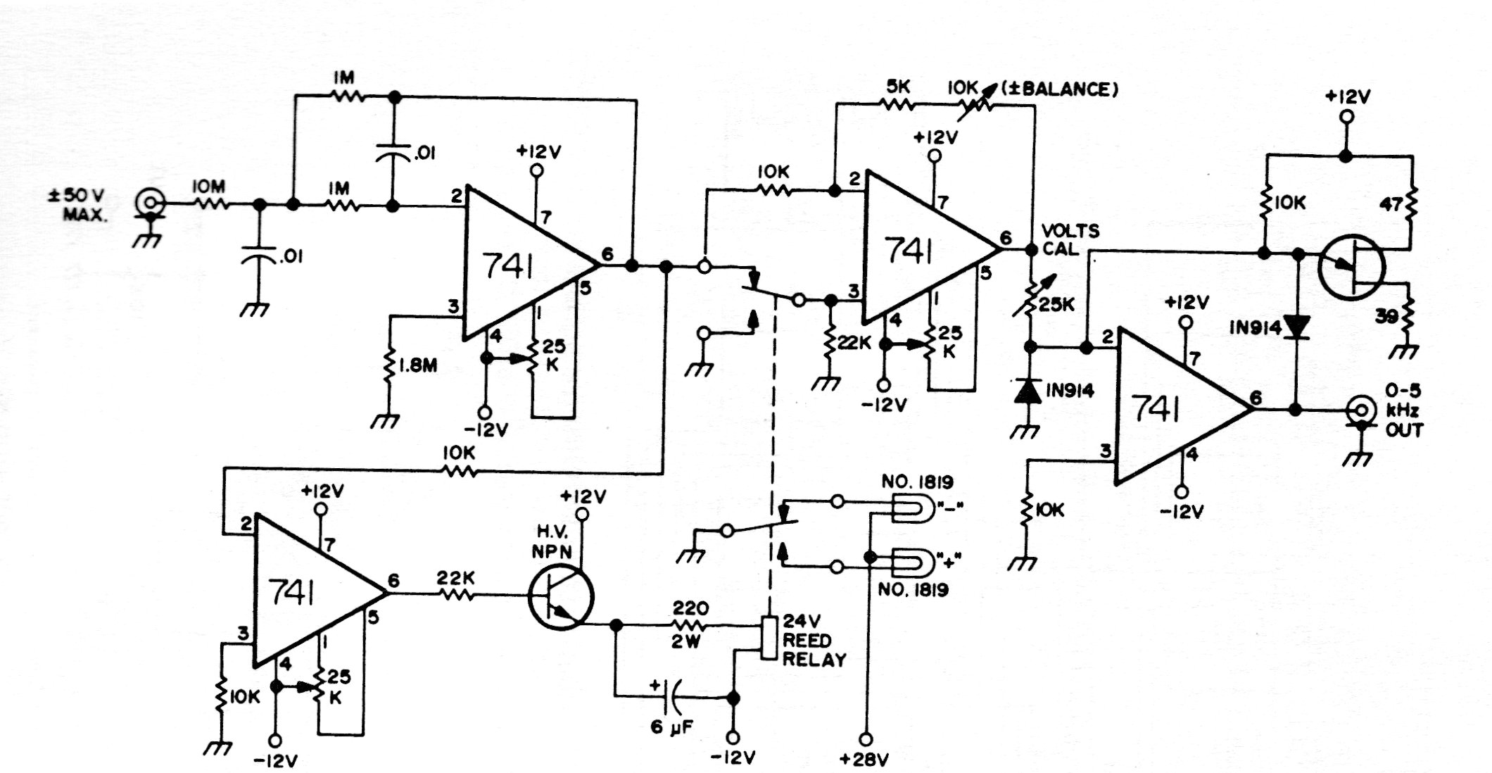 La finalidad de este circuito, que encontramos en una antigua documentación americana es permitir la lectura de frecuencias de audio en un multímetro común. El circuito utiliza componentes que aún son comunes, pudiendo ser montado con facilidad.