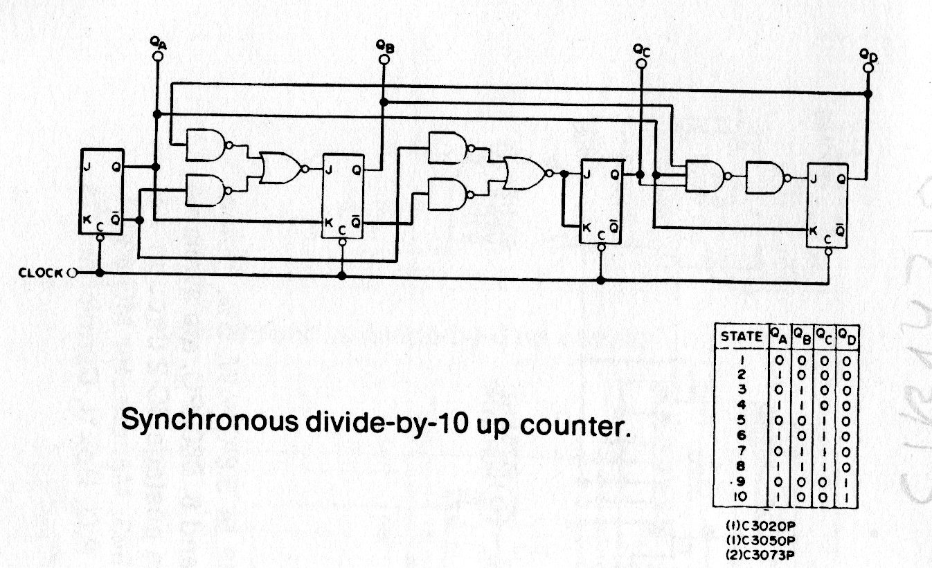 Este divisor por 10 sincronizado por ser implementado con base en lógica TTL o CMOS según la aplicación deseada. El circuito es de una documentación americana y la velocidad máxima depende sólo de la lógica utilizada.