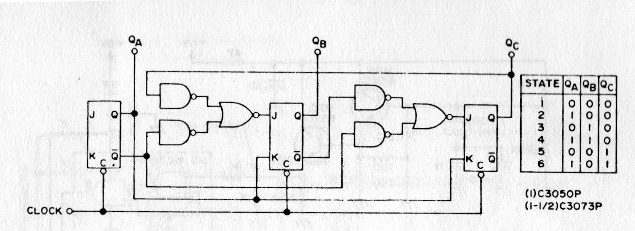 Este divisor por 6 sincronizado por ser implementado con base en lógica TTL o CMOS según la aplicación deseada. El circuito es de una documentación americana y la velocidad máxima depende sólo de la lógica usada;