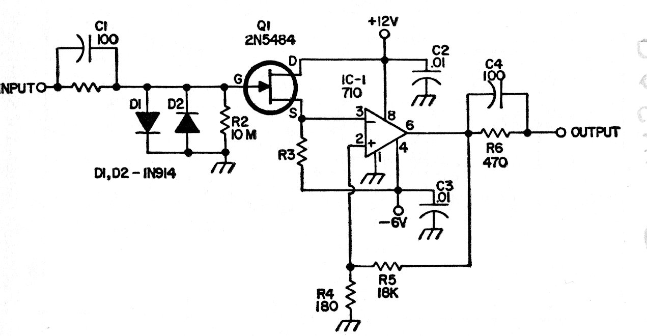 Este circuito se utiliza en frecuencímetros para aislar la salida. El circuito es de una documentación antigua. Se pueden utilizar amplificadores operacionales equivalentes.