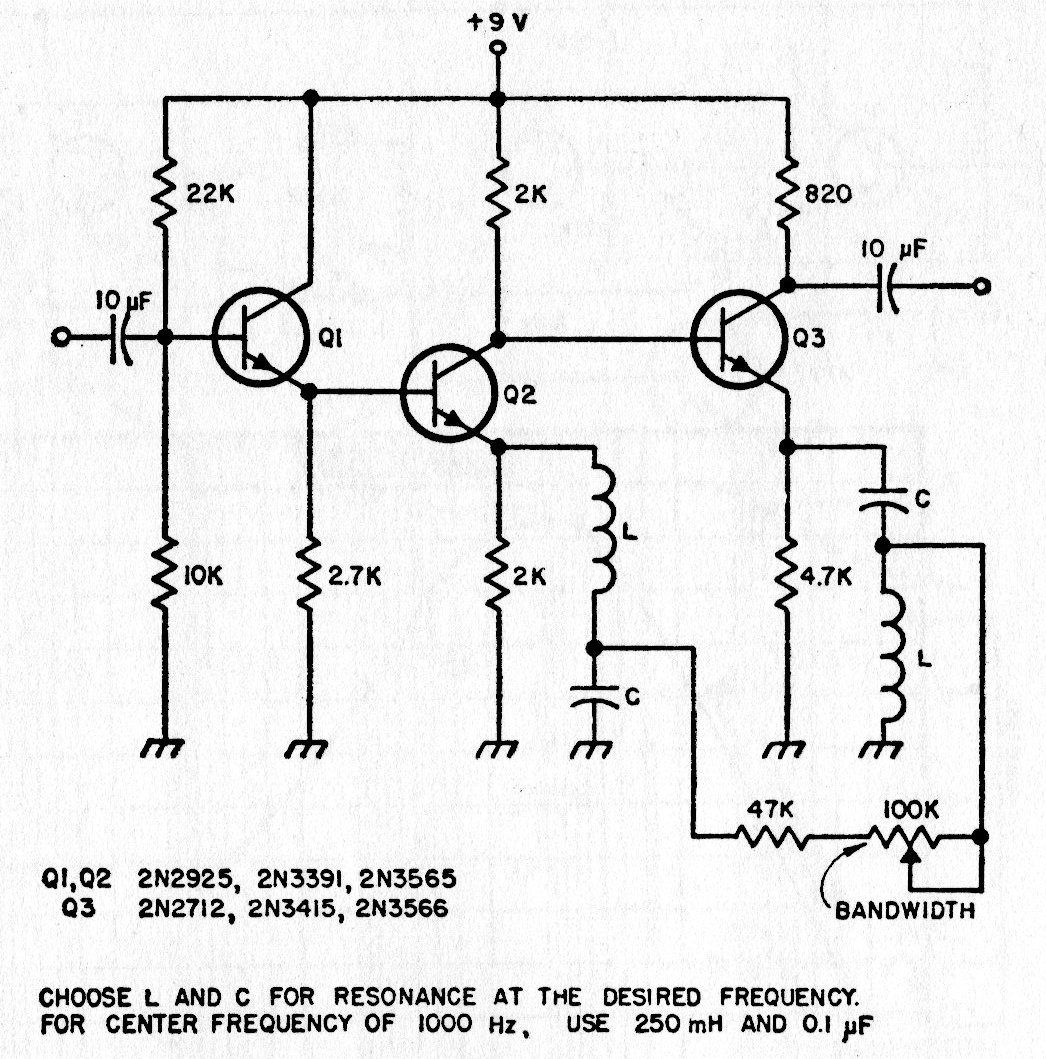 Encontramos este circuito en una antigua publicación americana de los años 80. Los transistores pueden ser tipos de uso general como los BC548 y la frecuencia de sintonía es dada por los componentes L y C.