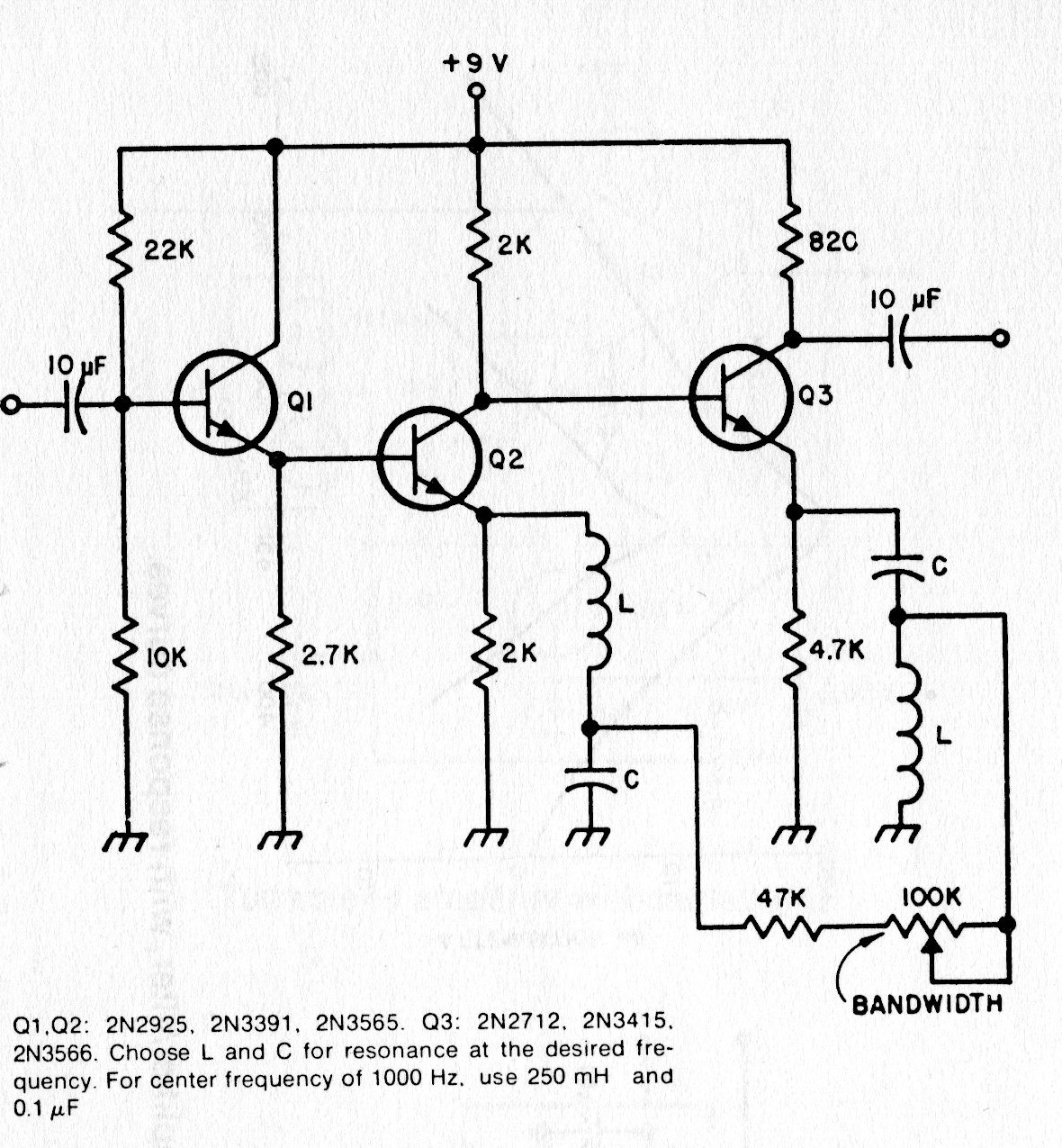 Los transistores para este circuito de una documentación de los años 80 pueden ser los BC548 o 2B222 y las bobinas con los capacitores en paralelo determinan la frecuencia que deja pasar. La alimentación puede ser alterada con el cambio de algunos resistores.