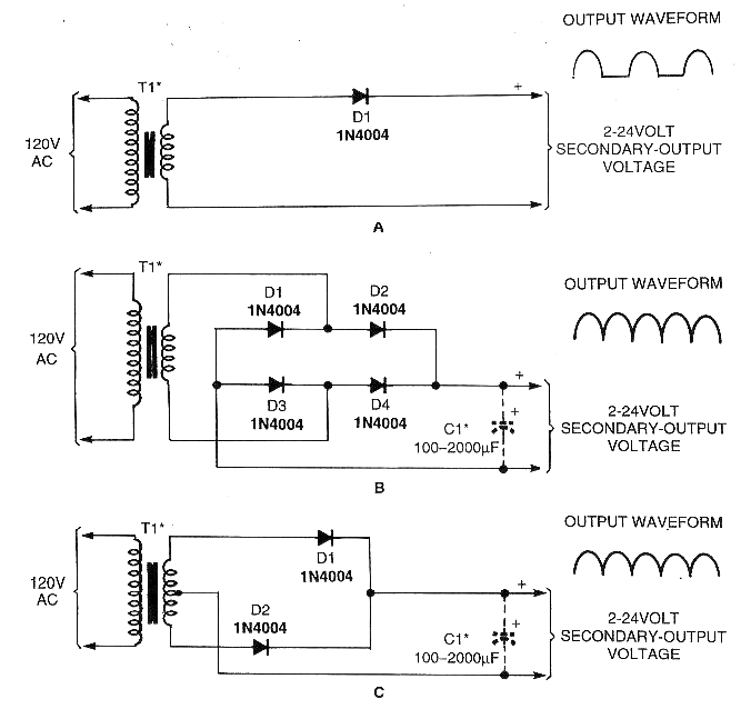 La revista Poptronics ya no existe, pero encontramos en su edición de mayo de 2000 estos circuitos simples de fuentes de alimentación. Estas fuentes no tienen regulación, protección y la primera ni siquiera el filtrado. El filtrado de las otras depende de los valores de los capacitores utilizados. Los transformadores pueden tener tensiones de 6 a 12 V y corrientes de 100 a 500 mA.