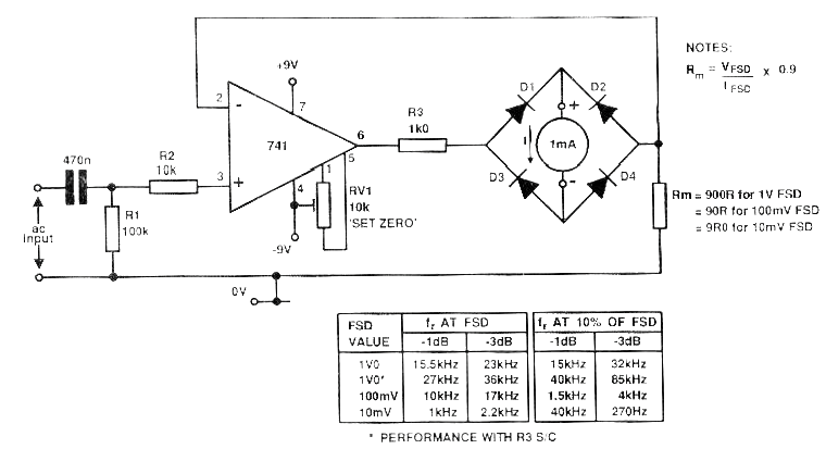 Este circuito se obtuvo en una revista inglesa de 1993, pero se puede montar fácilmente en nuestros días, ya que todos los componentes son comunes. En realidad, el operacional puede ser de tipos equivalentes. La fuente de alimentación debe ser simétrica de 6 a 12 V y los diodos pueden ser 1N4148 o equivalente. En este circuito la impedancia de entrada es muy alta.