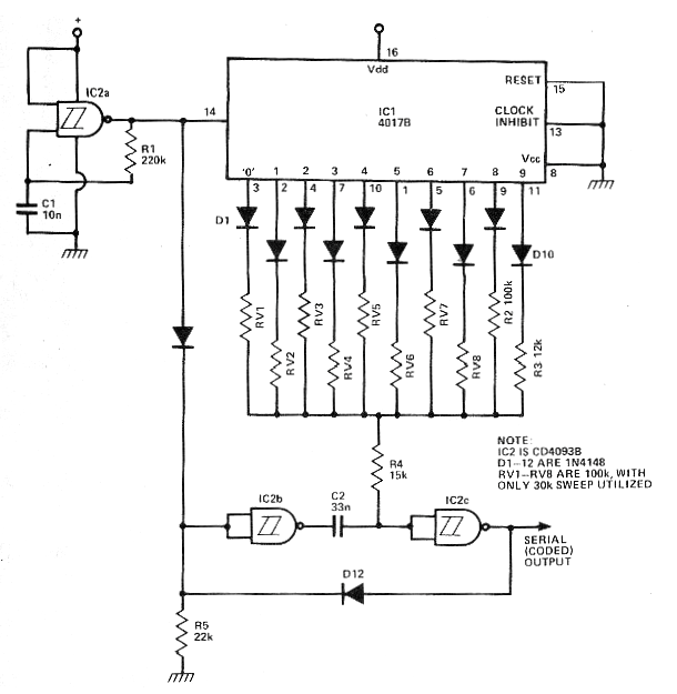 Este circuito se obtuvo en una revista inglesa de 1979, pero puede montarse con facilidad en nuestros días, ya que todos los componentes son comunes. El que hace el circuito es generar pulsos codificados para un sistema de control remoto. El decodificador para este circuito es el CIR9279S.