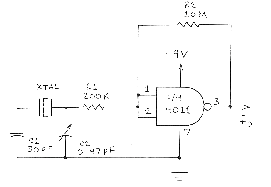 He encontrado este circuito em uma Modern Electronics de 1991. El circuito se puede montar com cristales de 100 kHz a 5 MHz e la tensión de alimentación se puede quedar entre 6 e 15 V.