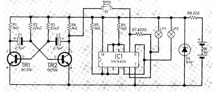 Este circuito se obtuvo en la revista Everyday Electronics de agosto de 1974. El circuito sigue siendo actual, ya que puede ser montado con los transistores BC548 y en lugar de las lámparas podemos utilizar LEDs en serie con resistores de 470 ohms. El circuito es TTL, habiendo una reducción por zener para 5 V para su alimentación.