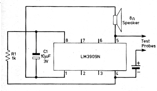 Este circuito se obtuvo en una práctica inalámbrica de 1978. Hace un altavoz emitir sonido cuando hay continuidad del circuito en prueba. El circuito es de ultra-bajo consumo, pudiendo ser alimentado por una sola pila durante meses.