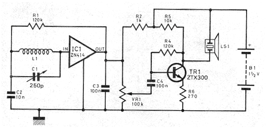 Este circuito fue obtenido en una revista inglesa de 1985. El N414 consiste en un receptor AM completo, no fácil de encontrar. El transistor puede ser el BC548 y el auricular debe ser de cristal o piezoeléctrico. La bobina consta de 100 espiras de hilo 28 en un bastón de ferrita de 10 a 15 cm. La variable se puede obtener de una radio AM fuera de uso. El circuito se alimenta con una sola pila AA o AAA.