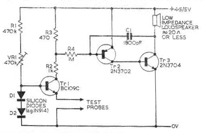 Este probador de continuidad para bajas resistencias fue encontrado en una revista inglesa de 1978. El circuito todavía puede ser montado si usamos transistores BC548 para los NPN y BC558 para el PNP. Los diodos pueden ser también los 1N4002.