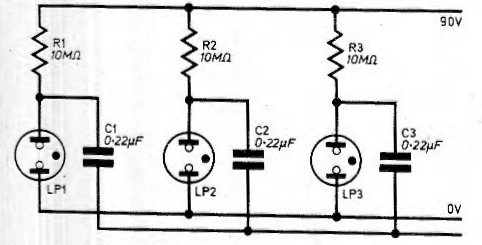 He encontrado este circuito simple una revista inglesa de 1984. El circuito puede ser montado con facilidad pudiéndose usar lámparas de neón comunes de cualquier tipo. La fuente debe ser de 90 a 120 V continuos, con baja corriente. La frecuencia de los intermitentes depende de los capacitores. El consumo del circuito es muy bajo, menos de 100 uA.