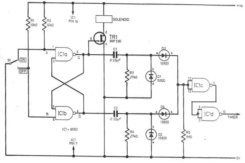 He encontrado este circuito simple una revista inglesa de 1984. El circuito puede ser montado con facilidad pudiendo ser usados transistores equivalentes al FET de potencia. El circuito genera pulsos agudos de corta duración y gran intensidad, los cuales se aplican al solenoide.