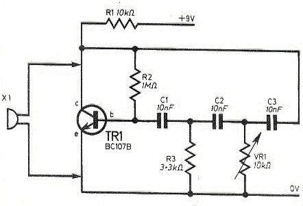 He encontrado este circuito simple una revista inglesa de 1984. El circuito se puede montar fácilmente con el uso de un BC548 en lugar del BC108 original. El circuito produce una señal en la banda de audio. El transductor es un auricular de cristal o del tipo piezoeléctrico.
