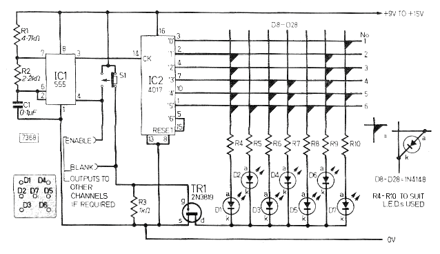 He encontrado este circuito en una revista inglesa de julio de 1982. El circuito sigue siendo viable porque todos los componentes todavía son comunes en nuestro mercado. Los diodos pueden ser de cualquier tipo de uso general y el FET un BF245. Observe la disposición de los LED para imitar la cara de un dado.