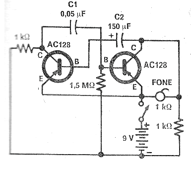 Este circuito de llama de peces fue encontrado en una revista de 1971. El circuito todavía se puede montar con transistores BC558. El auricular debe ser de cristal o una pequeña cápsula piezoeléctrica. La alimentación se puede realizar con tensiones entre 6 y 9 V. El circuito se instala en un cristal con el transductor acoplado a la tapa de modo que el sonido se pueda transferir al agua.