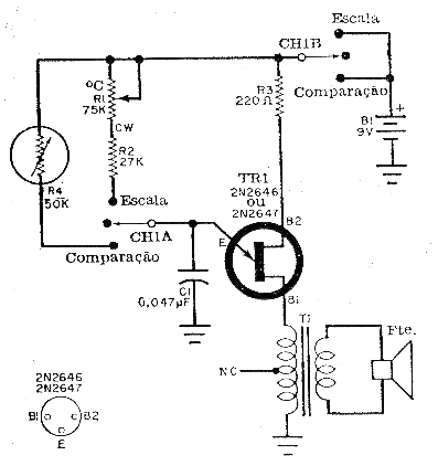 La idea de este circuito de una revista de 1970 es producir un tono que depende de la temperatura del sensor. Este tono puede ser comparado al producido cuando se coloca en el lugar del sensor un potenciómetro calibrado con una escala en Braile. De esta forma, un deficiente visual puede medir temperaturas con facilidad, El transformador con el altavoz puede ser reemplazado directamente por un pequeño altavoz con rendimiento un poco menor.