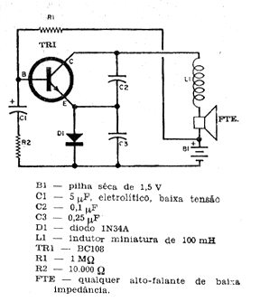 Este circuito se obtuvo en una revista de 1969. La revista ya no existe, pero el circuito se puede montar con un BC548. El circuito imita las gotas de agua que caen, de una gotera, pudiendo servir para algunas bromas interesantes.