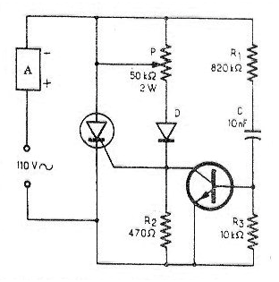 Este circuito de control AC con SCR tiene un rango dinámico diferente, dado por el transistor. El circuito es de una revista de 1967, pero aún puede ser montado con facilidad utilizando transistores BC558 y para el SCR el TIC106 de acuerdo con la tensión de la red. El potenciómetro debe ser de hilo. El diodo puede ser el 1N4004.