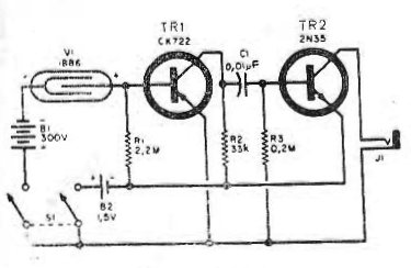 Este circuito fue encontrado en una publicación de 1962. En la época existían las baterías de alta tensión como la usada en este proyecto. Para una versión actual se puede utilizar un inversor con transformador, ya que el consumo es extremadamente bajo, del orden de menos de 1 mA para este sector. Los transistores pueden ser los BC558 para TR1 y BC558 para TR2; El auricular debe ser magnético de 200 ohmios a 2 k ohms. El componente crítico es la válvula Geiger.