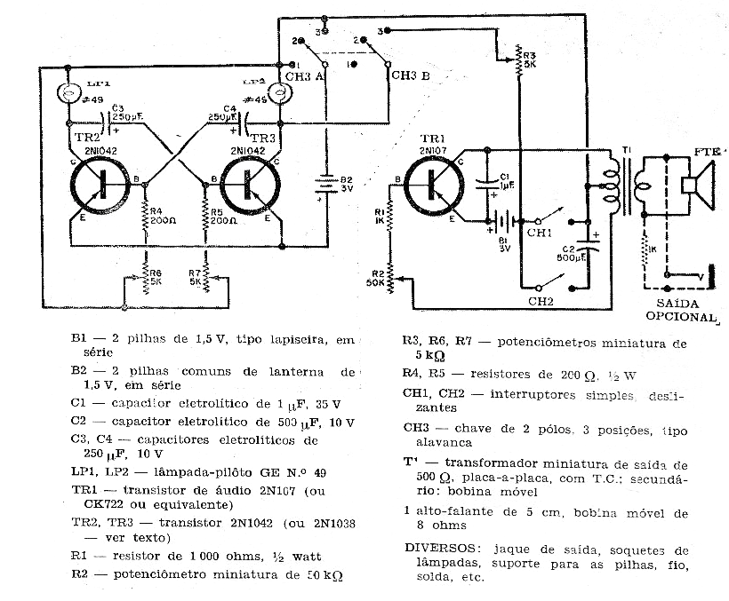 Este circuito, obtenido en una revista de 1965 todavía puede ser montado con la utilización de algunos componentes equivalentes modernos. Los transistores pueden ser los BC558 y el transformador se obtiene de una radio transistorizada fuera de uso.
