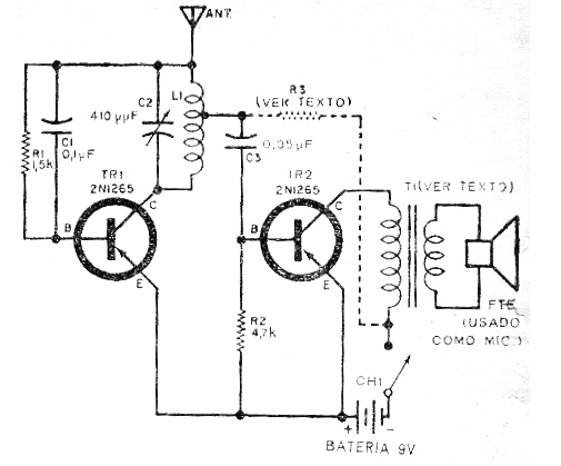 Este circuito fue encontrado en una revista de 1963, pero todavía se puede montar fácilmente con algunos componentes actuales Los transistores pueden ser los BC558 y el transformador se obtiene de una radio transistorizada fuera de uso. La bobina consta de 40 + 40 espiras de hilo 28 en un bastón de ferrita de 12 cm de longitud aproximadamente. La antena tiene de 30 a 50 cm y el alcance es de unos metros en el rango de 550 a 1600 kHz.