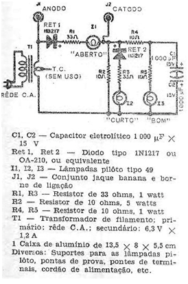Este circuito fue encontrado en una revista de 1963, pero todavía se puede montar fácilmente con algunos componentes actuales. Los diodos pueden ser los 1N4002 y las lámparas de 6 V x 50 mA. El circuito de prueba diodos rectificadores y de señal de todo tipo.