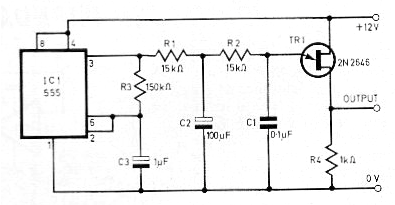 Este circuito se obtuvo en una revista inglesa de 1976. La señal del circuito se debe aplicar a un buen amplificador. La modulación es dada por el 555 que controla un oscilador de relajación con unijuntura. Los resistores R1 y el capacitor C2 y C3 se pueden cambiar para modificar el efecto sonoro.