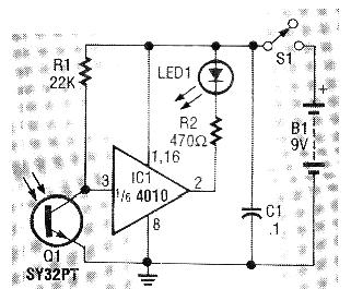 Este circuito salió en la revista estadounidense Electronics Now, en una edición de 1993. La revista ya no existe, pero el circuito puede ser montado con facilidad, ya que cualquier Foto-transistor puede ser usado. El LED se enciende cuando acercamos y accionamos cualquier tecla de un control remoto de infrarrojos común.
