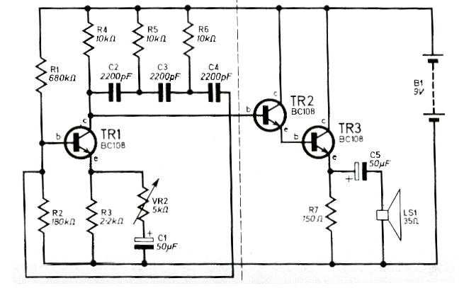 Este circuito fue encontrado en una revista inglesa de 1973. La revista ya no existe, pero el circuito puede ser montado si los transistores son cambiados por los BC548. Ajuste el punto de oscilación en el potenciómetro los capacitores C1, C2 y C3, que pueden ser cambiados, determinan la frecuencia del tono producido. El circuito también funciona con un altavoz de 4 o 8 ohms, pero con menor volumen.