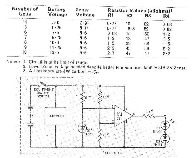Este circuito fue encontrado en una revista inglesa de 1979. La revista ya no existe, pero el circuito puede ser montado con facilidad, pues utiliza componentes comunes. Los resistores se pueden cambiar según la tensión deseada para el aviso de baja tensión. Ver la tabla.