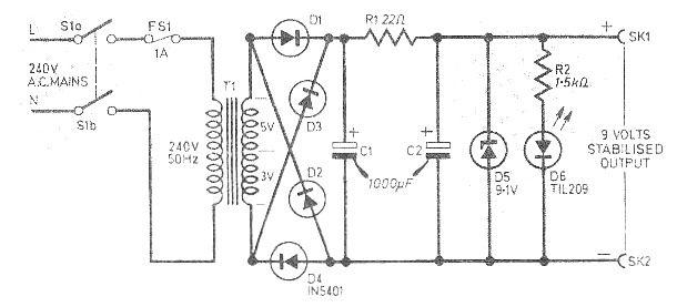 Este circuito se obtuvo en una revista inglesa de 1977. La revista ya no existe, pero el circuito se puede montar fácilmente. Esta fuente proporciona corrientes máximas del orden de 50 mA bajo tensión de 9 V. El transformador es de 3 + 3 V x 200 mA y los diodos pueden ser los 1N4002. El zener es de 1 W.