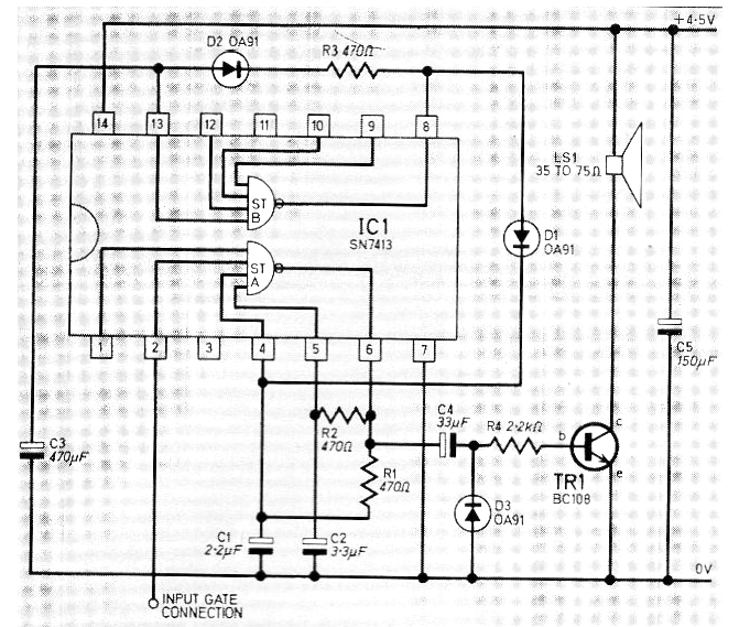 Este circuito es de una revista inglesa de 1976. Cambiando el transistor por un BC548, el circuito podrá montarse con facilidad en nuestros días los resistores de realimentación de los puertos TTL pueden ser cambiados para modificar el sonido. La alimentación debe realizarse con una tensión de 5 V.