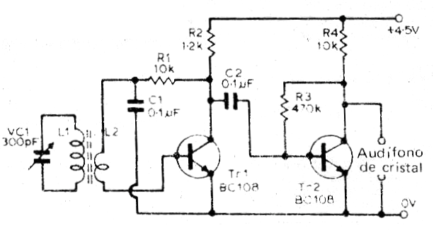 Originalmente, este circuito es de una revista inglesa, pero lo encontré en la Revista Radio Chassis Televisión de Argentina, en una edición de 1978. La bobina L1 está formada por 10 espiras de hilo 28 sobre L2 y L2 consta de 80 a 100 vueltas de hilo 28 en un bastón de ferrita. En la salida tanto podemos conectar un auricular como la entrada de un amplificador. Para las estaciones más débiles utilice una antena. La conexión de la variable en la bobina de la forma indicada resulta en una mejor selectividad. Utilice los BC548 en lugar de los BC108.