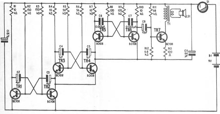 Hemos descubierto este circuito en una revista inglesa que ya no existe. La revista es de diciembre de 1972, pero el circuito puede todavía ser montado con facilidad bastando intercambiar todos los transistores por los BC548. El transformador T1 se puede obtener en la salida de audio de una vieja radio transistorizada. S1 es un interruptor de mercurio que se conecta cuando el búho se inclina.