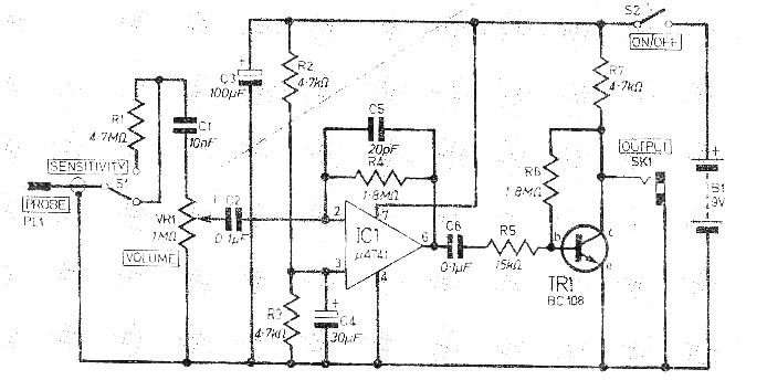 Este circuito fue publicado en una revista inglesa de 1980. La revista ya no existe, pero el circuito se puede montar fácilmente. Porque los componentes son comunes. El circuito tiene dos bandas de sensibilidad para las señales de audio y el transistor puede ser el BC548.