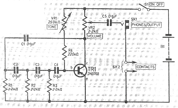 Este circuito fue obtenido en una revista inglesa de 1977. La revista ya no existe, pero el circuito puede montarse con facilidad, pues el transistor puede ser un BC558 y la salida debe ser para un auricular magnético de baja o media impedancia. La batería B1 es de 9 V.
