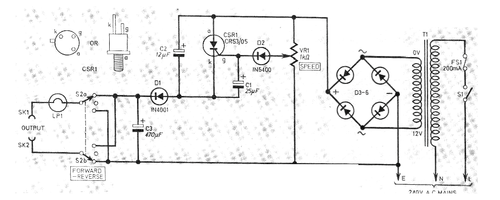 Este circuito fue obtenido en una revista inglesa de 1977. La revista ya no existe, pero el circuito puede montarse con facilidad, pues los diodos del puente pueden ser los 1N4004 y el SCR el TIC106. El transformador tiene 12 V x 1 A de secundario y primario según la red de energía.