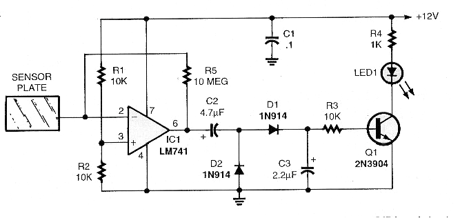Este interesante circuito se obtuvo en un Poptronics de febrero de 2001. La revista americana ya no existe en su forma impresa, pero este circuito es todavía viable, pues utiliza componentes comunes .. El transistor puede ser el BC548 y en lugar del LED se puede controlar un relé. El circuito no debe ser alimentado por fuente sin transformador.