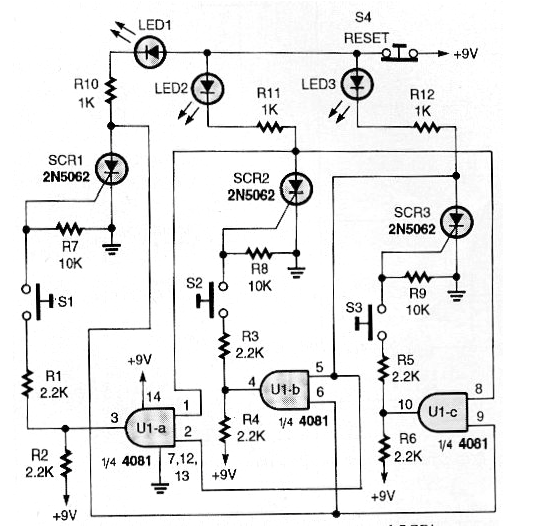 Este circuito se obtuvo en una Popular Electronics de 1994. La revista ya no existe en su versión impresa, pero el circuito se puede montar fácilmente, ya que los componentes son comunes. Esta versión con circuitos integrados CMOS y SCRs es para Tres jugadores y acciona indicadores LED. Los SCR pueden ser los TIC106 o equivalentes. La alimentación de 9 V puede ser hecha con batería, pues el consumo es bajo.