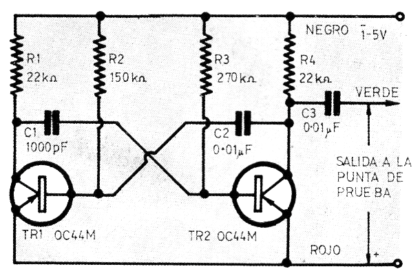 Este circuito fue encontrado en una revista Radio Escuela Gráfica, de la Argentina publicada en la década del 70. La revista ya no existe, pero se puede montar el circuito utilizando transistores PNP de uso general como los BC558, si el lector no encuentra en una chatarra los originales. El circuito genera una señal de audio rica en armónicos que sirve para pruebas también en circuitos de RF.