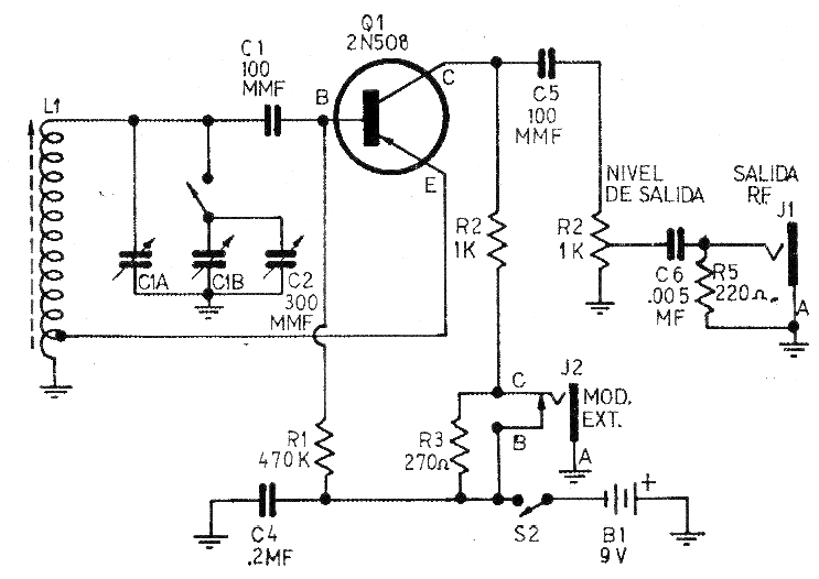 Este circuito fue encontrado en una revista Radio Escuela Gráfica, de la Argentina publicada en la década de 70. La revista ya no existe, pero se puede montar el circuito utilizando una bobina con unas 200 espiras de hilo 28 en un bastón de ferrita para frecuencias alrededor de 1 MHz y para el transistor se puede utilizar el BC558, eventualmente con alteración de los resistores de base.