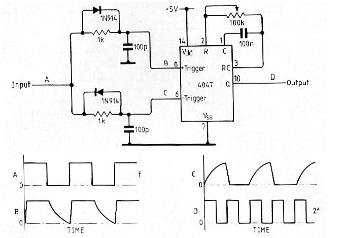 Este circuito fue encontrado en una revista Electronics World de 1990. El circuito puede ser montado actualmente, pues los componentes son comunes de la serie CMOS. La frecuencia máxima de entrada es de algunos megahercios dependiendo de la tensión de alimentación, pues el circuito funciona de 5 a 15 V. Las formas de onda obtenidas se dan en la misma figura.