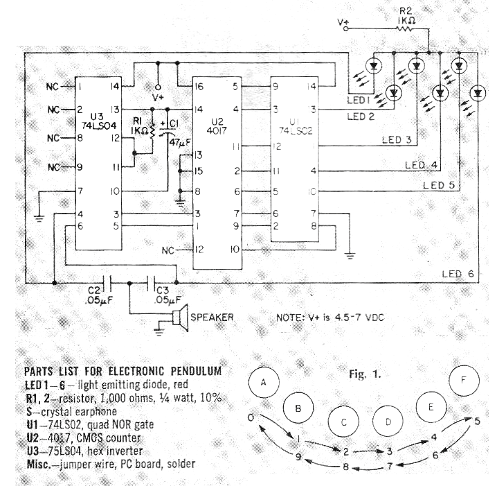 Este circuito es de la revista americana que ya no existe Science & Electronics, edición de marzo-abril de 1981. El circuito hace 7 LED parpadean secuencialmente a un ritmo de va y viene, con velocidad que depende de R1 y C1. Estos componentes se pueden cambiar. El transductor de sonido es del tipo piezoeléctrico. La alimentación debe realizarse con una tensión de 5 V.