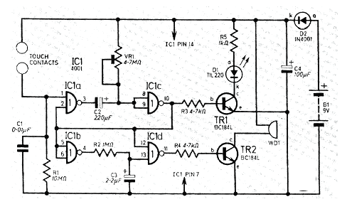 Este "egg timer" o temporizador para cocción de huevos fue encontrado en una revista inglesa que ya no existe de 1982. Los transistores pueden ser los BC548 y los demás componentes son comunes. El circuito inicia la temporización, que se ajusta en VR1, cuando tocamos en las dos placas sensoras. El aviso es un buzzer piezoeléctrico con oscilador.
