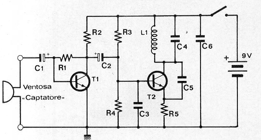 He encontrado este circuito en una Radio Elettrónica de diciembre de 1976. La revista italiana ya no existe, pero con el cambio de algunos componentes el circuito puede ser montado con facilidad. Por ejemplo, cambiamos el BC107 por el BC547, BC548 o BC549 y el 2N918 por un 2N2222. El sensor consiste en una bobina captadora o ventosa colocada junto al auricular del teléfono. La bobina L1 consta de 4 espiras de hilo 26 o 28 en forma de 1 cm sin núcleo. Sin antena el alcance es del orden de 10 m, pero se puede conectar una pequeña antena en el colector de T2 para aumentar el alcance.