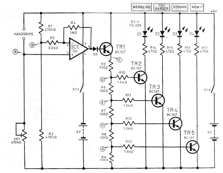 Este circuito fue encontrado en una revista inglesa de 1978, pero todavía puede ser montado, bastando sustituir los transistores BC107 por equivalentes actuales como los BC547. El circuito proporciona una indicación de la fuerza con que se aprieta los electrodos que no son más que bastones de metal. En el circuito la conexión de estos bastones es indicada como handgrips. El ajuste de la escala según la fuerza se realiza en VR1.