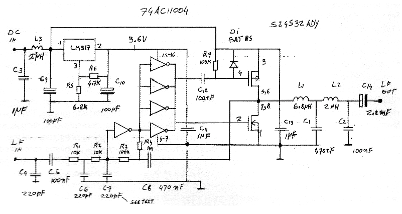 Este circuito de 2005 fue encontrado en una publicación inglesa pudiendo ser implementado con prácticamente cualquier par complementario de transistores MOSFET de potencia. Los transistores deben estar dotados de calor y la corriente de la fuente compatible con la potencia del circuito, en el caso, del orden de 1 A, ya que el circuito no es de alta potencia.