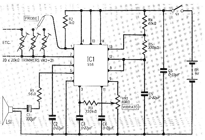 Este circuito fue obtenido en una revista inglesa de 1977. Se trata de un instrumento musical de juguete que utiliza un doble 555, es decir, un circuito integrado 556. El circuito es actual y el teclado puede ser hecho con chapas de metal que deben ser tocadas por una punta de prueba. El circuito también funciona con 6 V y el ajuste de vibrato se realiza en VR1.